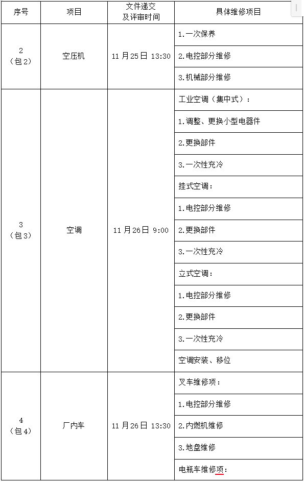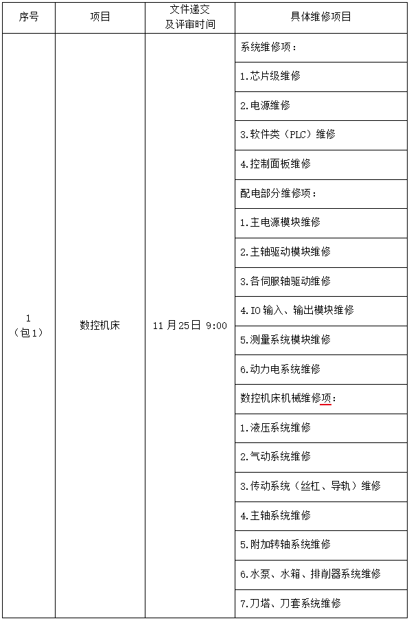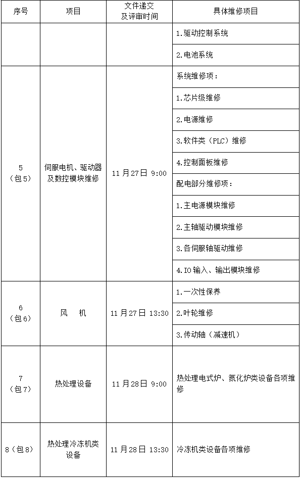 2.1本项目包含设备外委维修保养事项共12项,(1)维修事项包括:数控机床、空压机、空调、厂内车、伺服电机和驱动器及数控模块维修、风机、热处理设备、热处理冷冻机类设备、电机和磁盘;(2)设备搬运事项;(3)电梯年度维护保养和起重机年度维护保养。